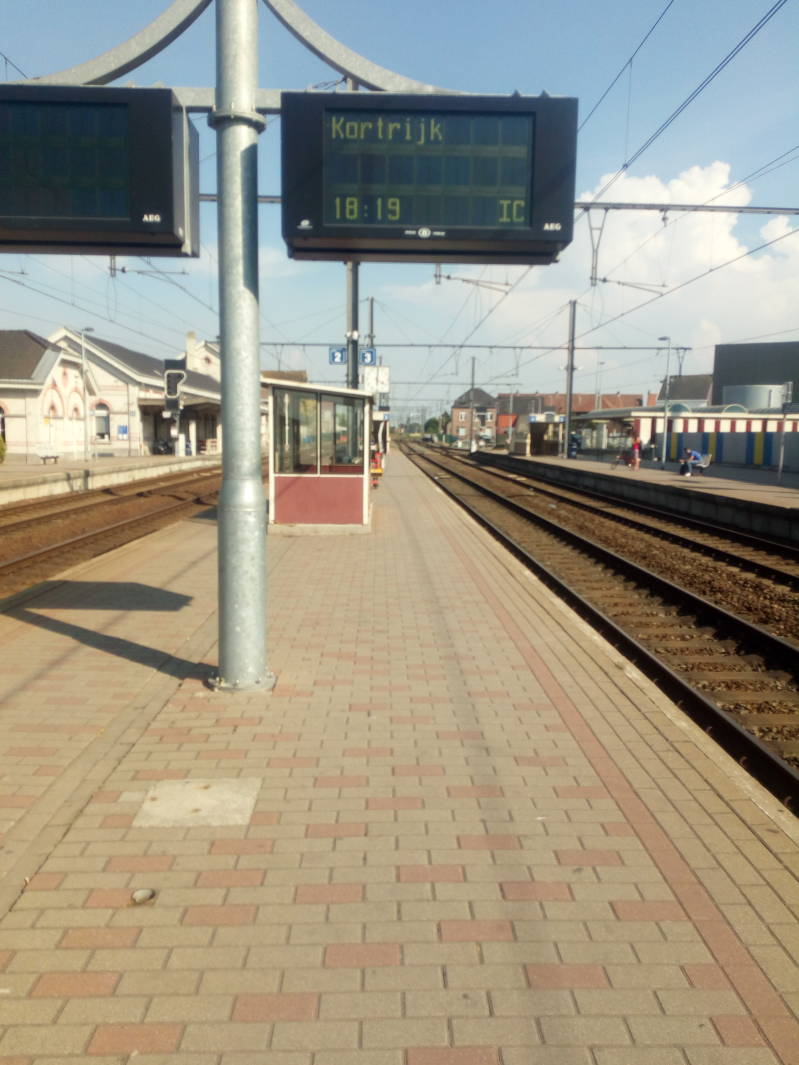 Hiernaast, zie je de aankondigingsborden in Sint-Niklaas. Deze hangen hier nog niet zolang. De trein op het andere perron is de trein van Sint-Niklaas naar Kortrijk, via Lokeren, Dendermonde, Brussel en Ath.