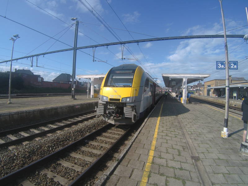 De trein richting De Panne vertrekt op 1 van de vernieuwde perrons in Gent-Sint-Pieters. Op dit uur komt deze MS96 aan vanuit Landen en rijdt hij verder onder een andere treinnummer naar De Panne. Deze trein is nog gestopt in De Pinte, Deinze, Tielt, Lichtervelde, Kortemark, Diksmuide, Veurne, Koksijde en De Panne.