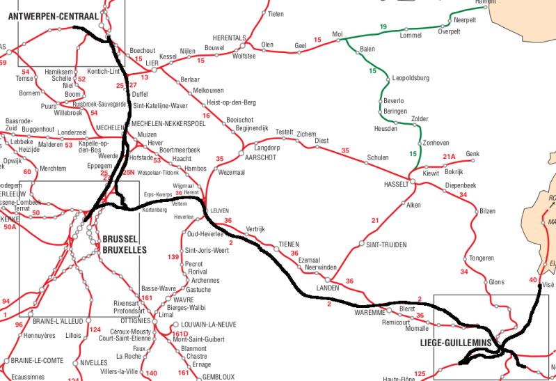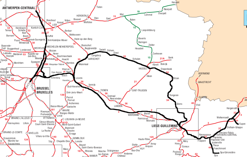 - 2x Spa, Franchimont, Theux, Juslenville, Pepinster-Cité, Pepinster, Liège-Guillemins, Leuven, Mechelen, Antwerpen-Berchem en Antwerpen-Centraal