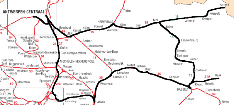 - 2x Antwerpen-Zuid, Hoboken-Polder, Hemiksem, Schelle, Niel, Boom, Ruisbroek-Sauvegarde, Brussel-Centraal, Brussel-Noord, Mechelen, Heide, Kalmthout, Kapellen, Ekeren, Antwerpen-Luchtbal