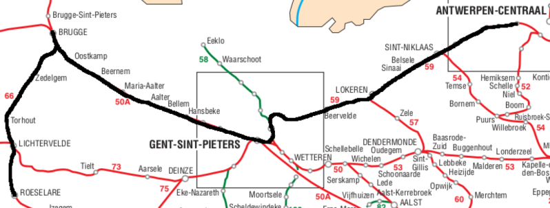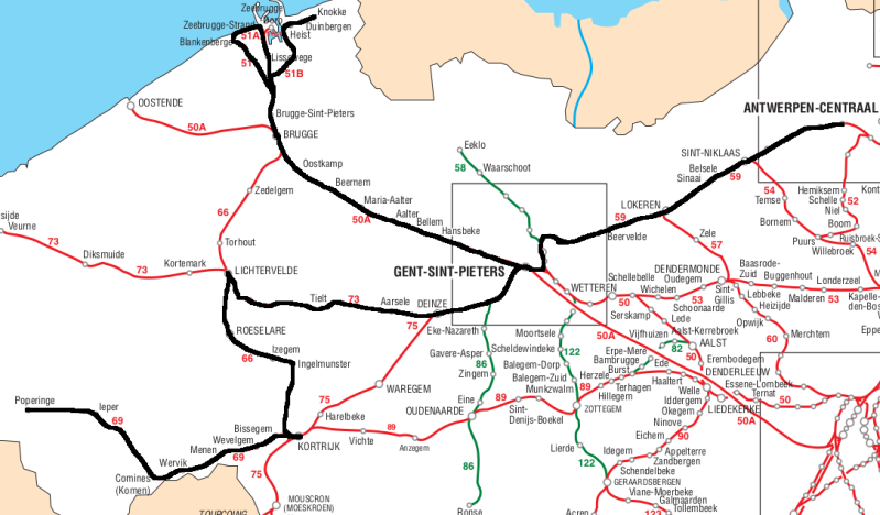 - 2x De Pinte, Deinze, Tielt, Lichtervelde, Kortemark, Diksmuide, Veurne, Koksijde, Gent-Sint-Pieters, Brussel-Zuid, Zwijndrecht, Halle en Jurbeke