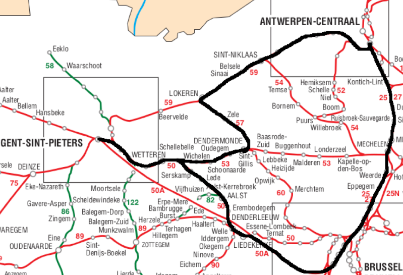 - 2x Welle, Haaltert, Lokeren, Sinaai, Belsele, Sint-Niklaas, Nieuwkerken-Waas, Beveren, Melsele, Zwijndrecht, Brussel-Noord, Brussel-Centraal, Brussel-Zuid en Jette