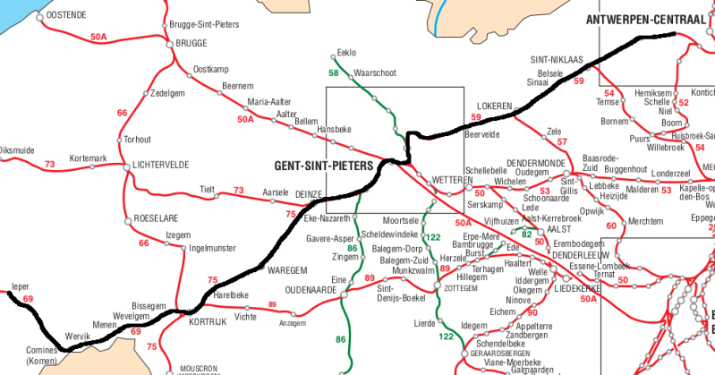 - Spoorlijnen: 59, 57, 60, 50, 0, 96, 94, 75A, 75, 89, 122, 90, 50A en 58
