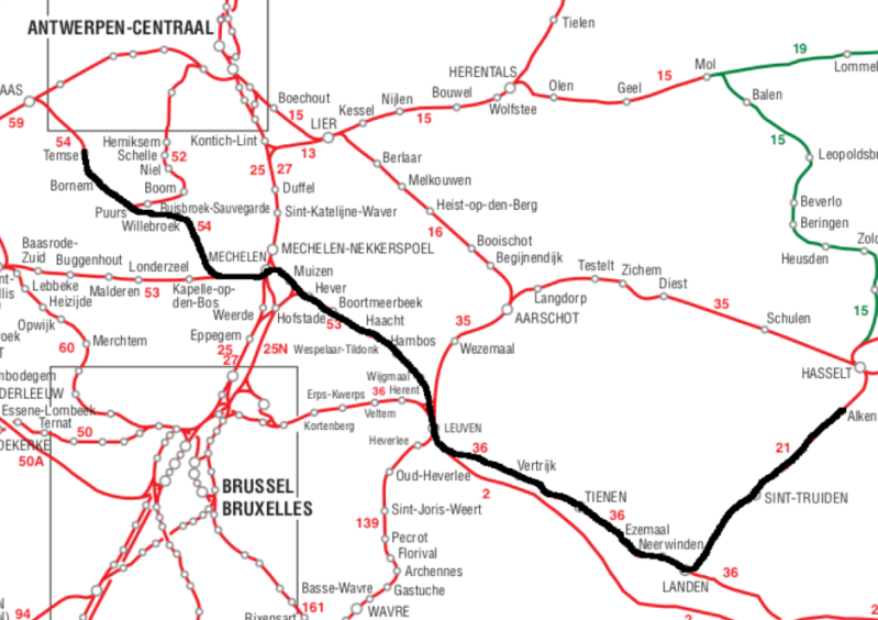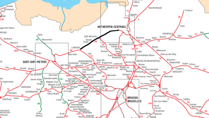 - Spoorlijnen: 59, 58, 50, 50A, 0, 25N, 36C, 36, 125, 161, 161D